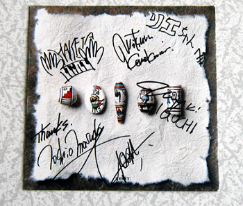 私が、羽毛田さんを知るきっかけとなった「Euphoria」というバンドのCDジャケットに書いてもらったもので、バンドのみなさんのもあります。 左上が羽毛田さんのものですが、最後の「A」があるのです! 余談ですが、右上の名前は確か、羽毛田さんが書いてくれたと記憶してます。(しいなさん談) しいなさんがすごいお宝を送ってくださいました!うむ、確かにAがある。そして爪がない!配置もちょっと違うし…鍵盤も違う!これは15年ぐらい前でしょうか?サインもすごいけど、私このCD(中身)ほしい…。 |